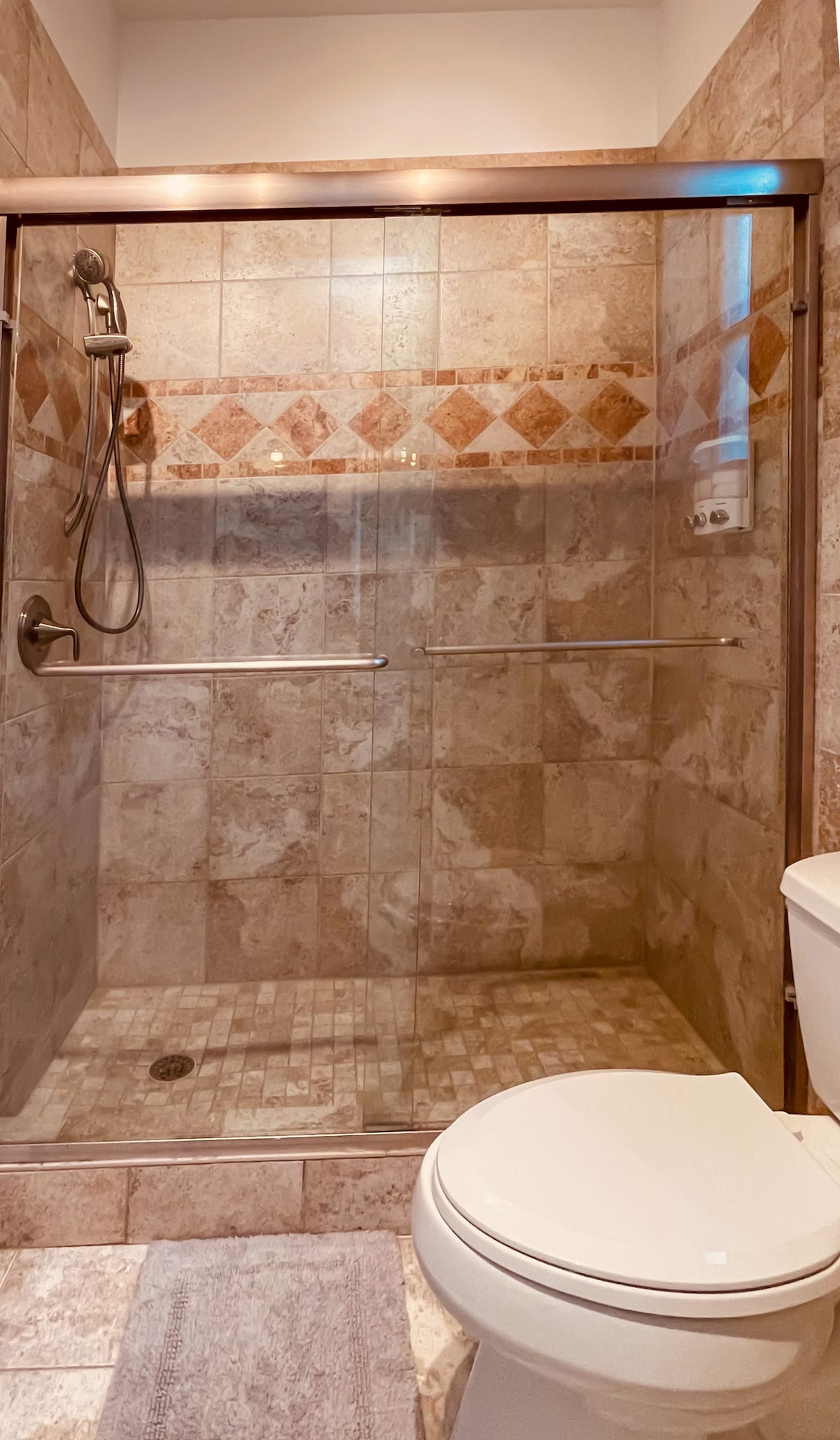 • Private glassed-in shower, toilet, granite vanity.