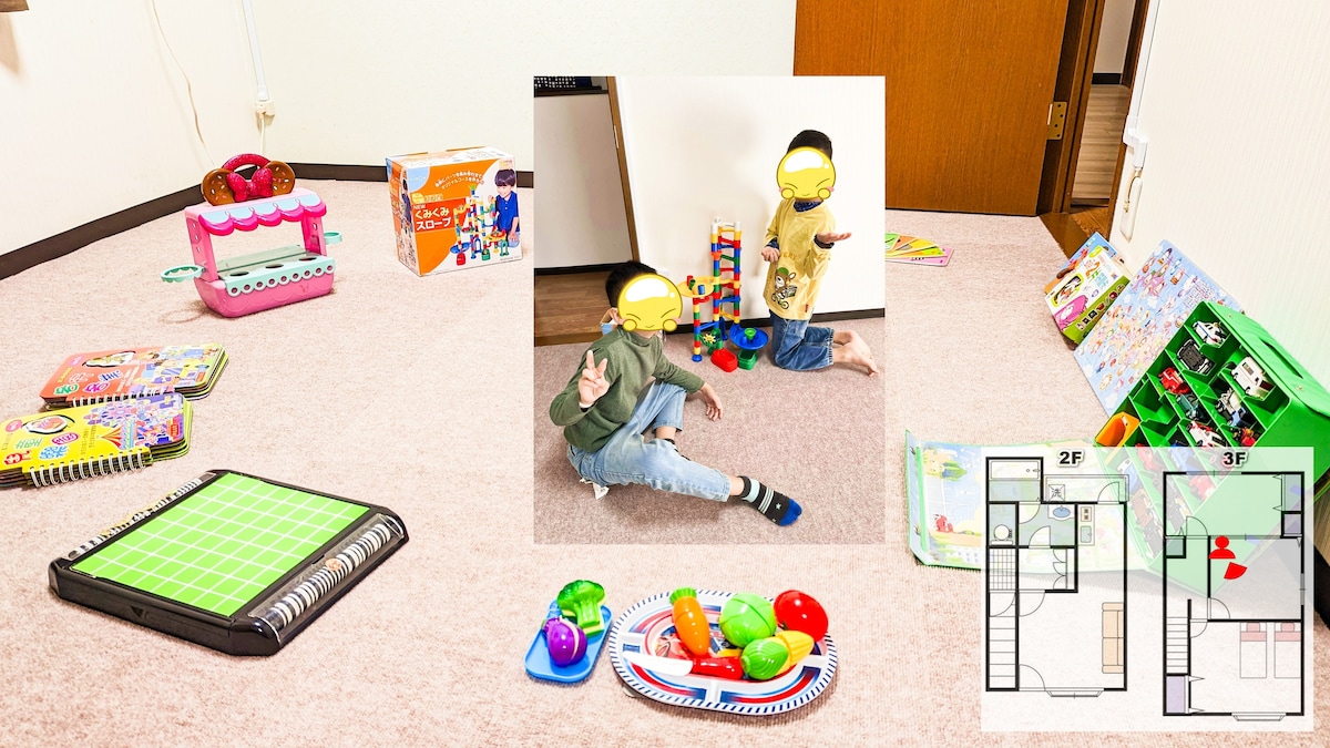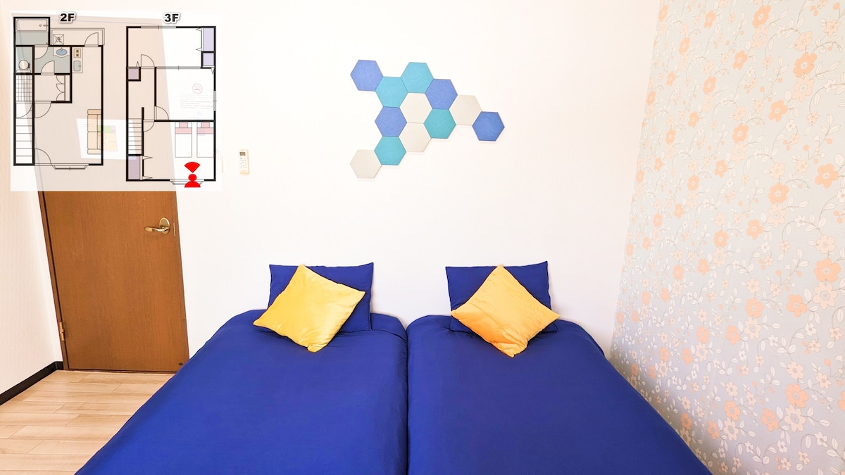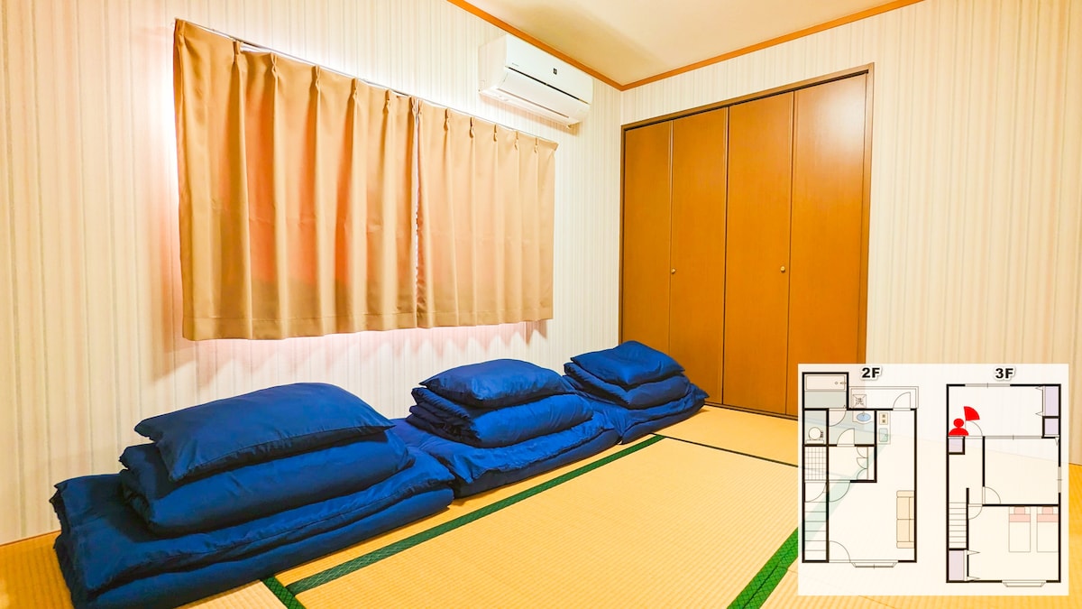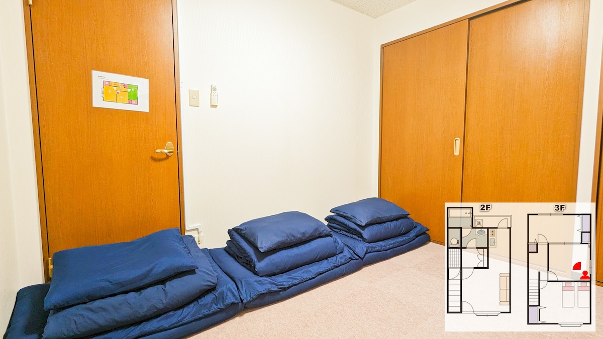 One room has 2 single beds, another is a tatami room with 3 futons.