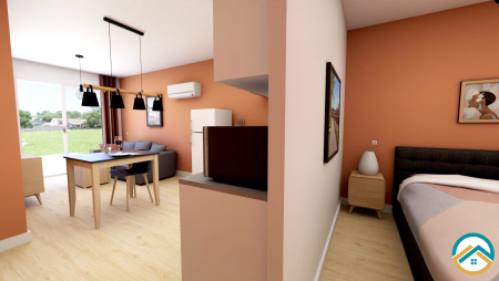 Conçu pour votre confort, cet espace allie praticité et convivialité avec une cuisine ouverte sur le salon avec 2 grandes fenêtres offrant une grande luminosité et un coin chambre intimiste (sans fenêtre), doté d’une salle d’eau attenante pour plus de commodité.