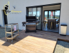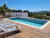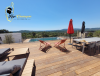 Une très belle terrasse en IPE, avec une grande table à manger, barbecue au gaz, grand salon de jardin, avec transats et parasols. Grande piscine peu profonde avec vue Mer.