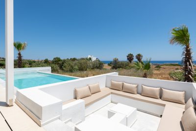 This luxury oasis combines it all: it enjoys immediate beach access to a beautiful and quiet beach while it shows great detail in offering over-the-top accommodation with sea view bedrooms and an embedded Jacuzzi in one of them. Minimal in style the villa uses a white-beige palette for the interior spaces with modern furniture, hand-painted paintings, and appliances of the highest quality.