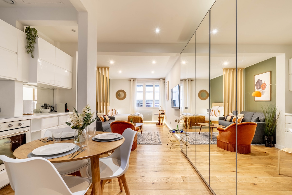 Tastefully refurbished, the apartment boasts a warm, soothing atmosphere. Particular attention has been paid to decoration and well-being. The apartment's soundproofing allows you to escape the hustle and bustle of the city center. Once inside, you'll forget you're in the city center.