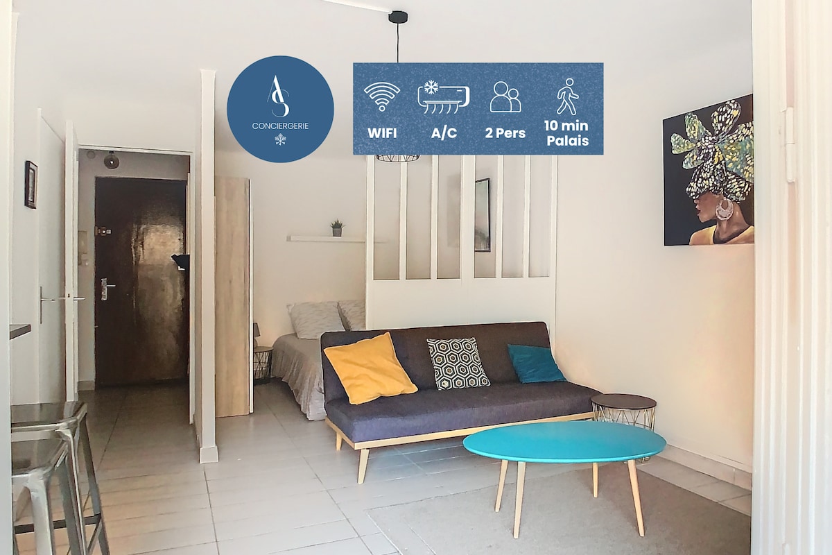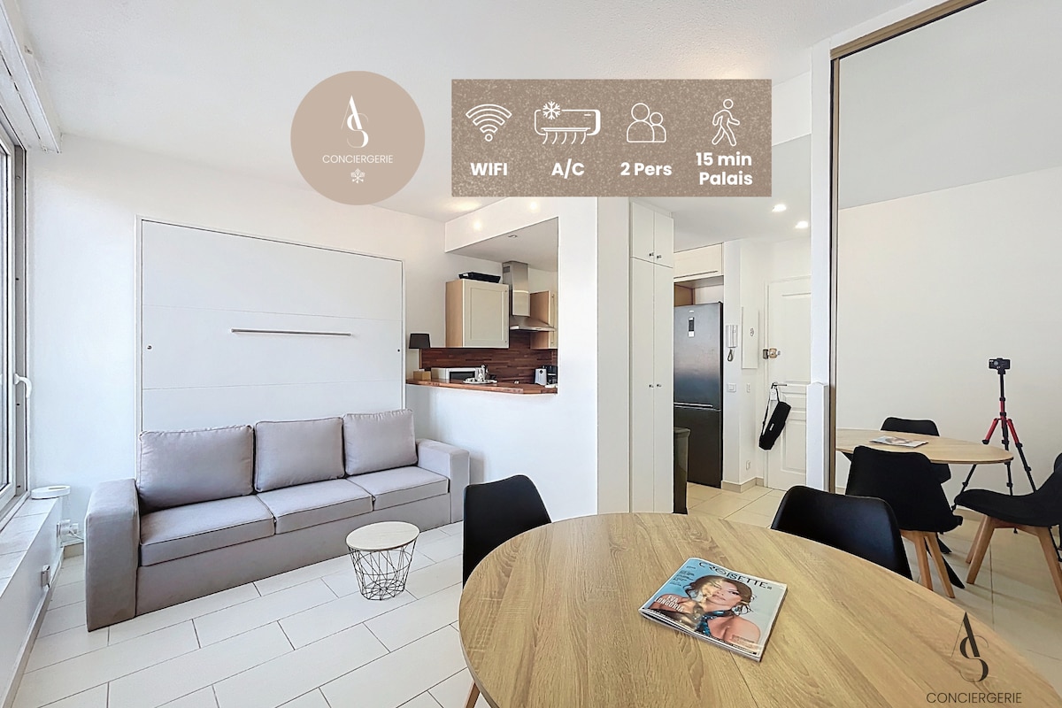 Bienvenue dans ce studio Gatsby chic, baigné de lumière et idéalement situé à 10 minutes du Palais des Festivals et des plages.