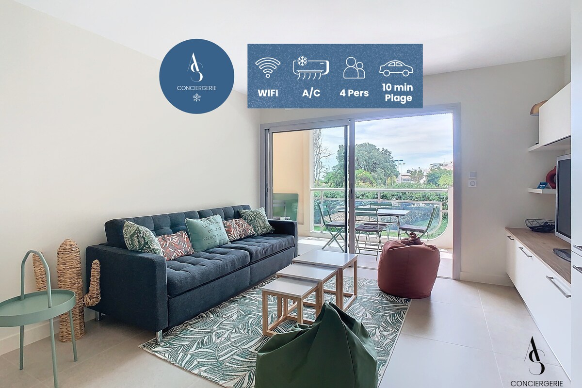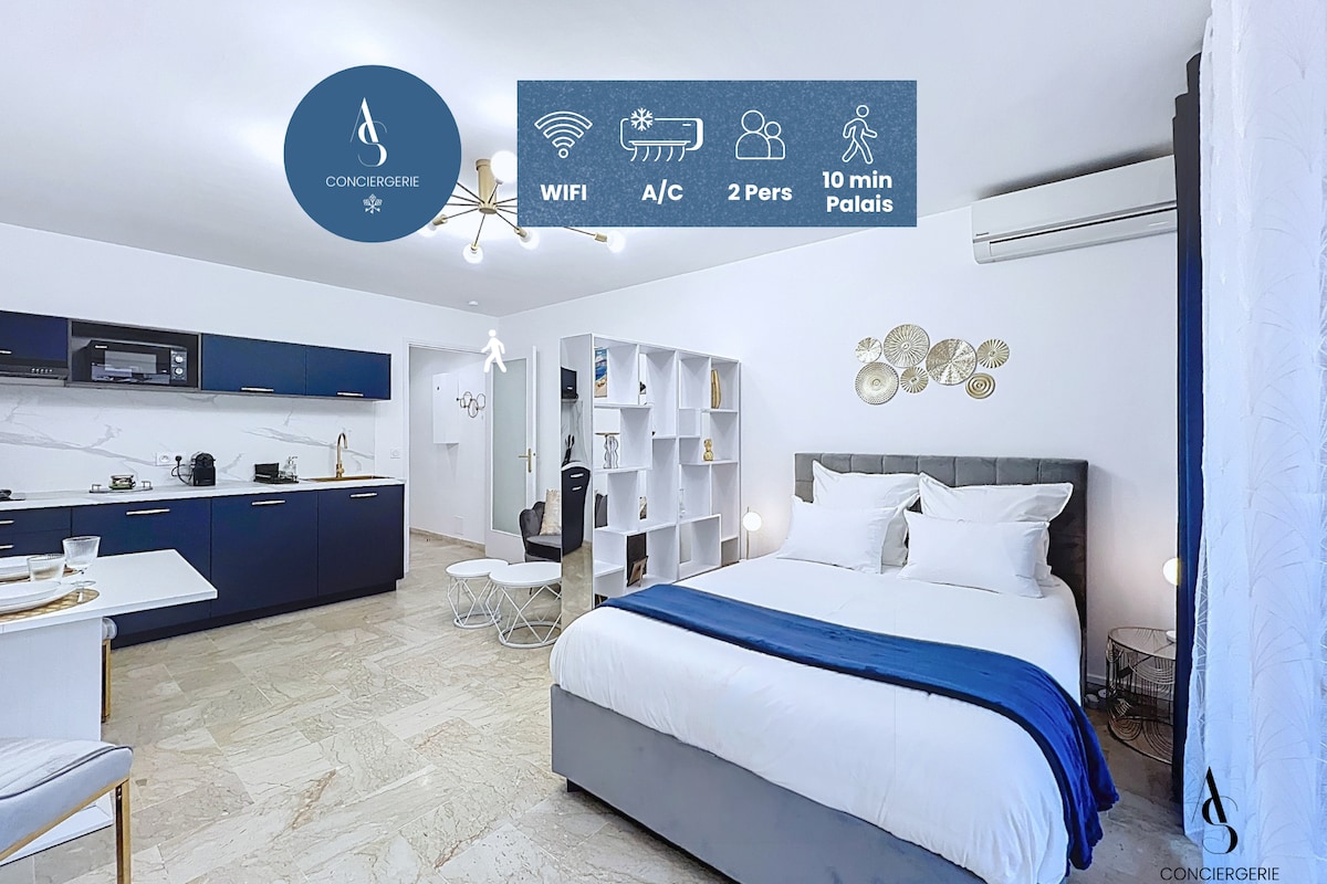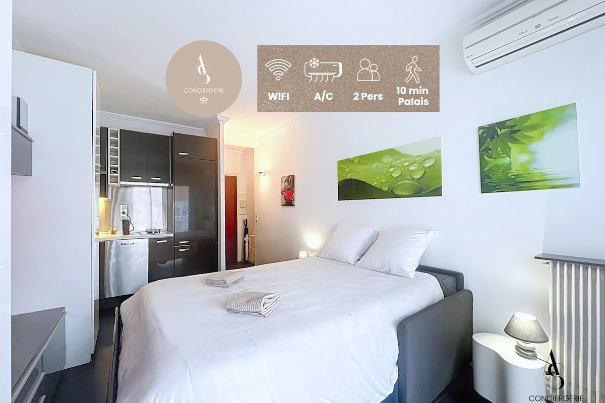 Bienvenue dans ce studio Gatsby chic, baigné de lumière et idéalement situé à 10 minutes du Palais des Festivals et des plages.