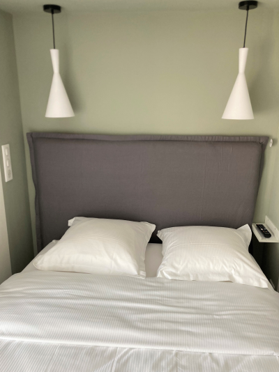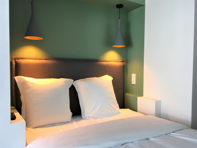 Estúdio com cama de casal e sofá-cama, com kitchenette totalmente equipada (placa, forno, frigorífico, micro-ondas, máquina de café expresso, torradeira, chaleira, etc.) e casa de banho com WC, duche, lavatório, toalheiro.