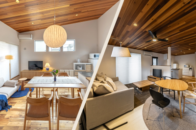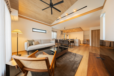 湘南の海辺に佇む、素朴すぎず飾らない、自然素材に包まれたモダンスタイルに自然素材を融合させたくつろぎ空間。アースカラーをアクセントに、”余白”によりリラックスした抜け感と、若葉を連想させるインテリアで、家族でのびのび過ごせるお部屋です。