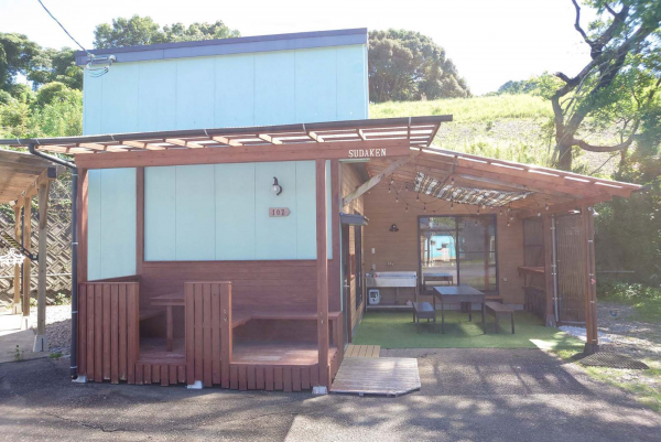 サーフキャンプ108は、大きなテラスと、キッチン、リビング、ダイニングがある広々物件。ロフトの寝室にはダブルベッドとセミダブルベッドがあり、リビングにはセミダブルベッドがあります。テラスにはソファーもあるので、内と外でかなり広々、さまざまな使い方ができます。ファミリーでも子供がロフトで、大人がリビングのベッドに泊まれ、友達同士でもプライバシーも保ちつつ、短期でも長期でも過ごせます。もちろんサーファーの皆さんにも使いやすいように入り口にはサーフボードラックや、テラスにはシャワー、水道も完備、ウェットスーツも外で洗えます。また、駐車スペースでは、バーベキューもできます(BBQセット有料貸出可能)。コンパクトでありながら異なる2つの空間を使って、時には外のテラスで、バーの様にワイワイと、時には静かにチルな音楽でもかけながらゆっくりと、またリビングには100インチのプロジェクターがあるので、大画面で映画も見れます。
