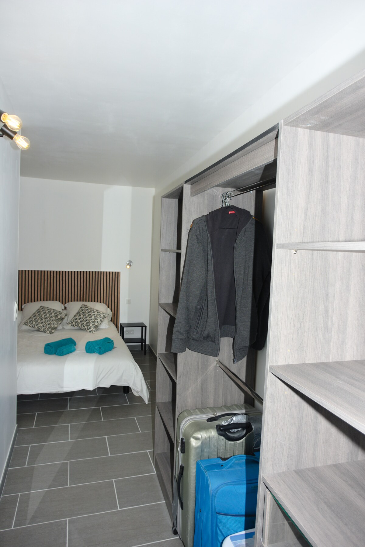 Chambre principale : Grand lit confortable, Penderie intégrée, Téléviseur.