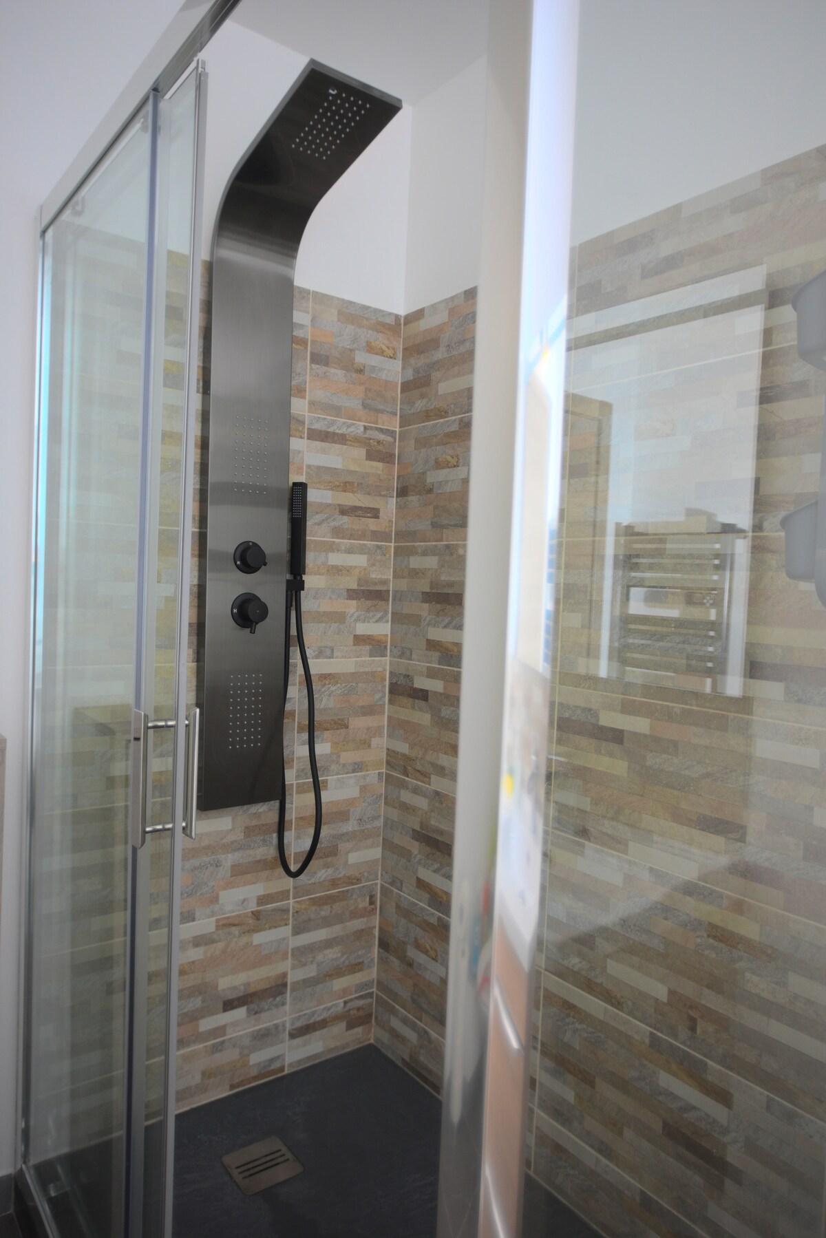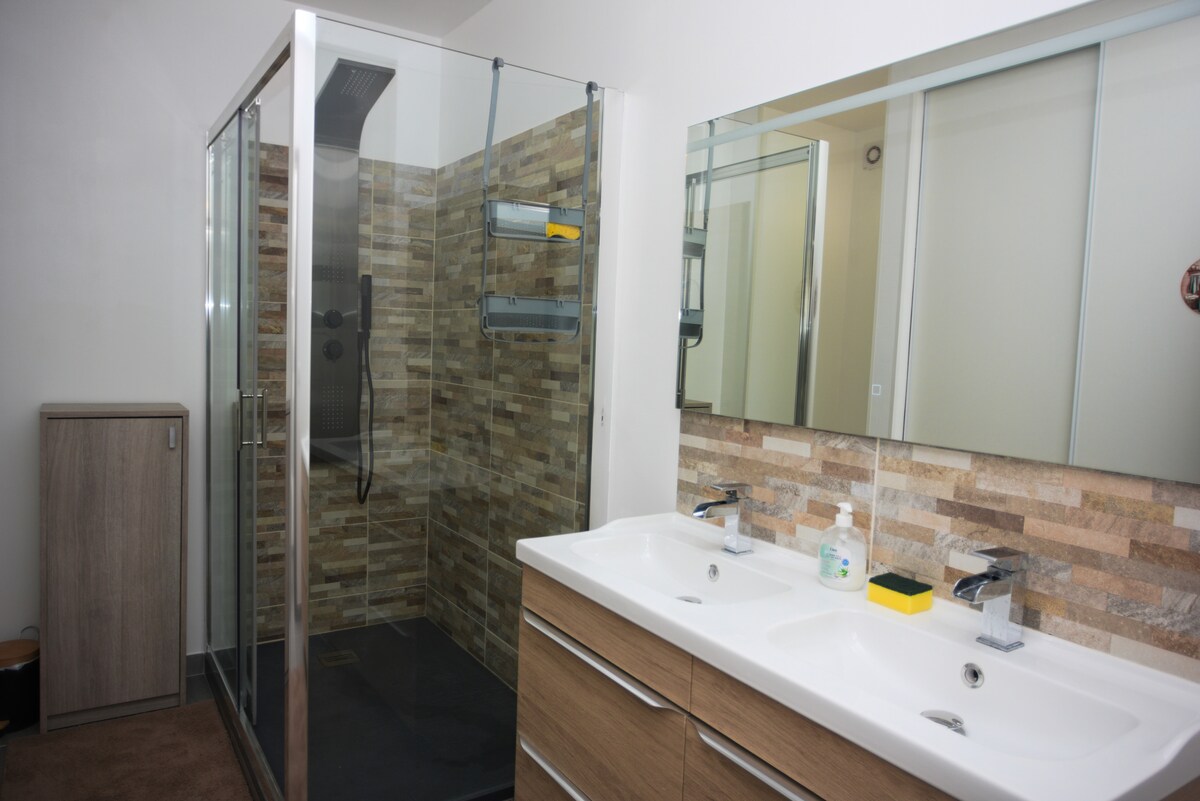 Salle d'eau moderne : Équipée d'une grande douche et d'un double vasque, d’un lave-linge, sèche-linge et des toilettes, pour un confort optimal.