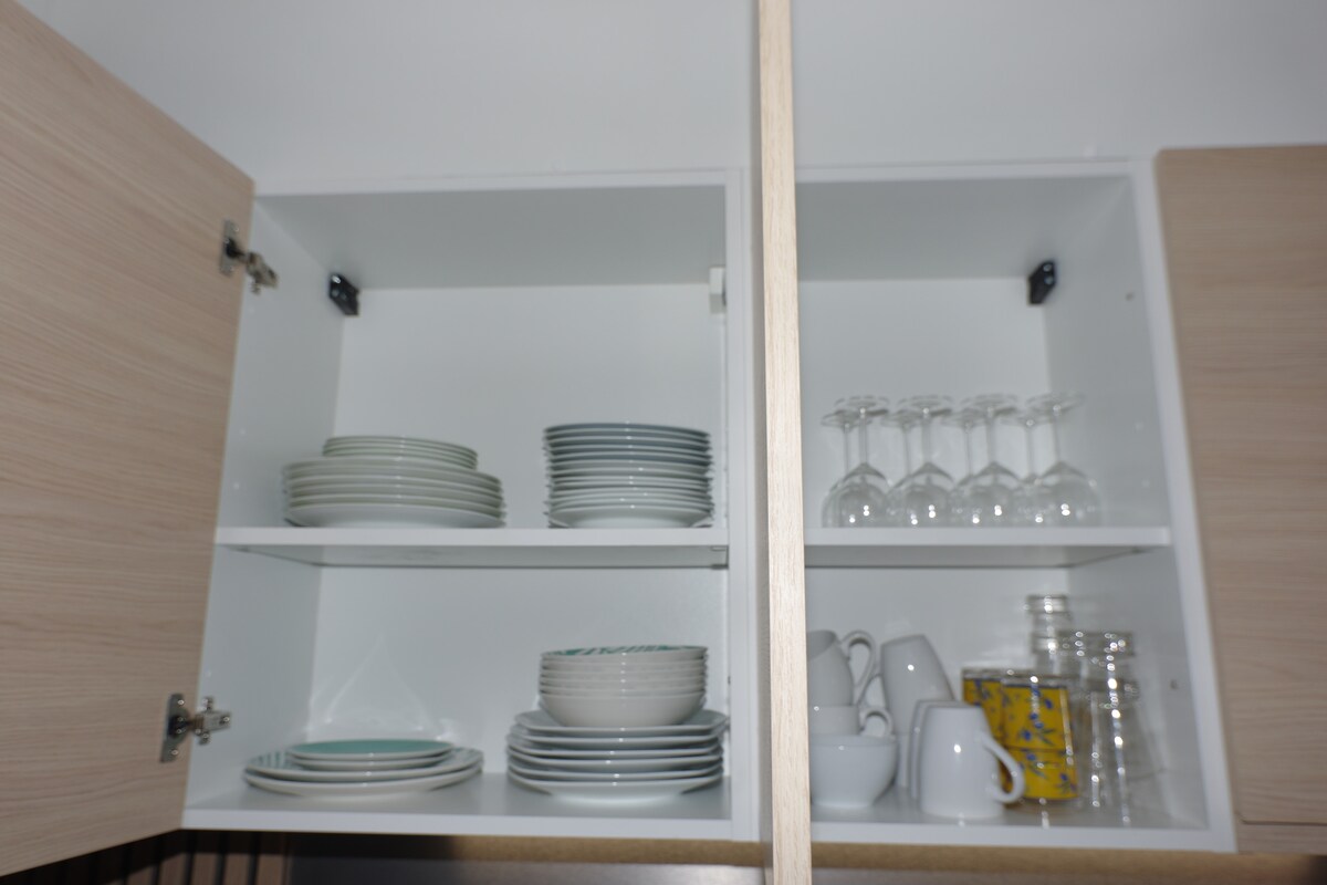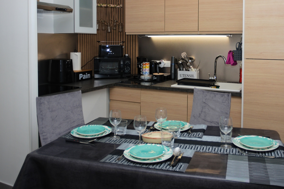 Cuisine entièrement équipée : Four, micro-ondes, cafetière, lave-vaisselle, et tous les équipements nécessaires pour un quotidien pratique.