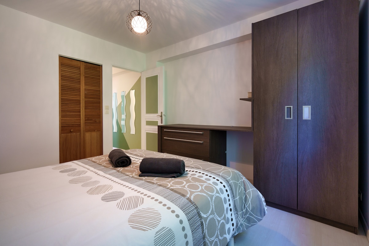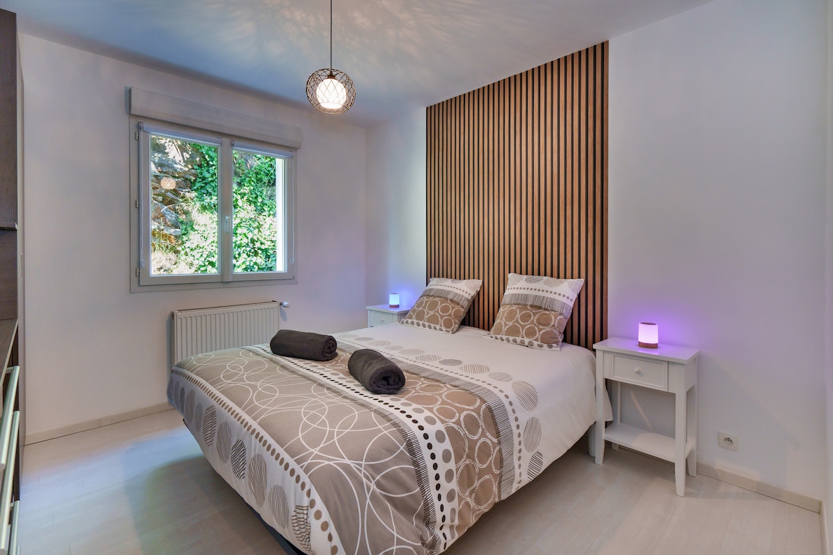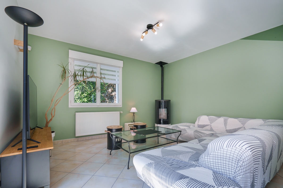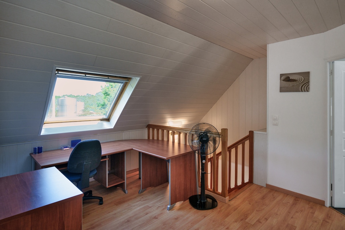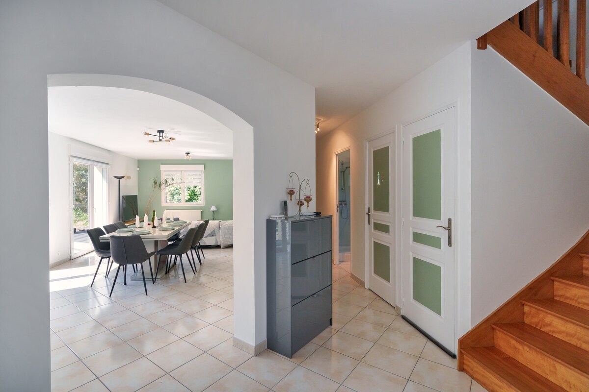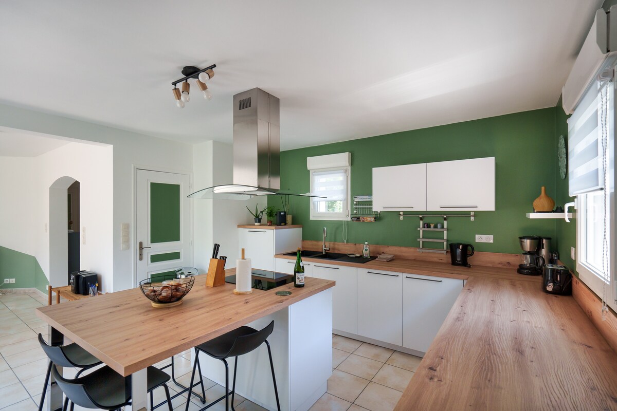 Aux portes de la ville et à proximité immédiate des grands axes, cette maison spacieuse peut accueillir jusqu’à 8 personnes. Lumineuse et chaleureuse, elle offre un cadre idéal pour un séjour confortable en famille ou entre amis, dans un environnement calme et verdoyant.