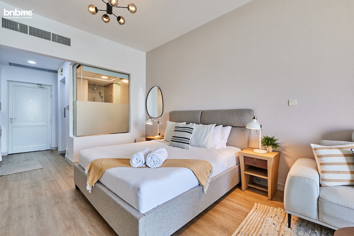 Indulge in coastal luxury at this stylish studio in Palm Views West, where contemporary interiors, a plush King bed, and a private balcony with breathtaking sea and Ain Dubai views create the ultimate retreat. Just a 6-minute walk from Nakheel Mall, immerse yourself in luxury shopping, fine dining, and entertainment at your doorstep. This exclusive residence offers access to top-tier amenities, including a fitness centre, swimming pool, and secure parking. Savour delicious meals at The Strand or Arabiska, and unwind along the pristine sands of Palm West Beach, all just moments away. Whether for a short escape or extended stay, bnbme’s daily housekeeping and concierge services ensure your seamless and unforgettable experience.