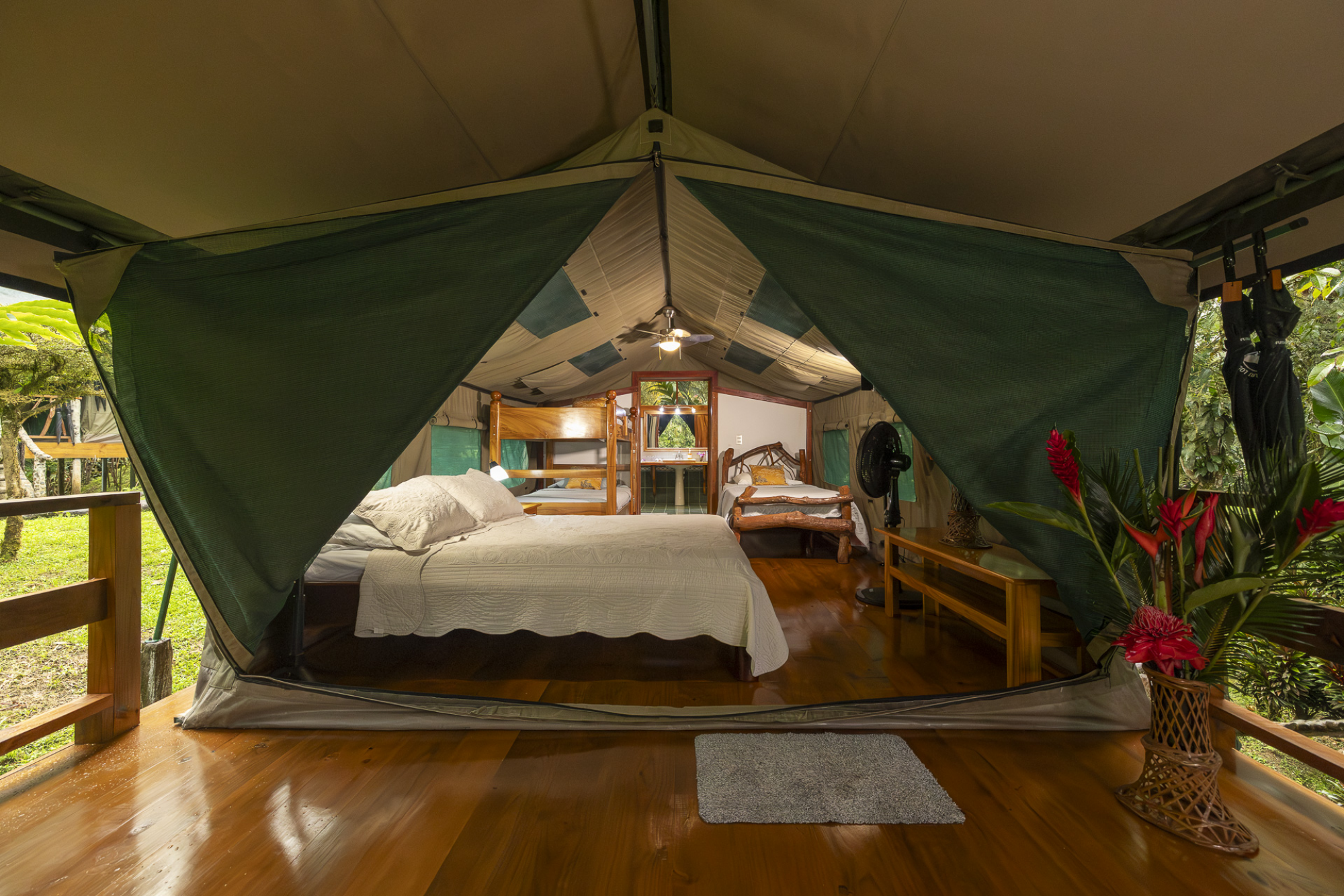 | Luxury safari tent The luxury safari tents have a unique view of the tropical forest. The tent has a double bed and 2 single beds and can sleep 4 people. - Private hardwood porch with rocking chairs