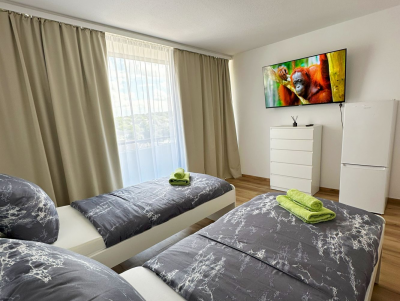 | Wohn-/ Schlafzimmer 1 • 1 Schlafsofa, 2 Einzelbetten Schlafzimmer 2 • 3 Einzelbetten Schlafzimmer 3 • 2 Einzelbetten | 3 Zimmer Apartment |