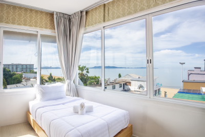 This Deluxe Suite with Sea View has a cable TV and air conditioning, sofa area.