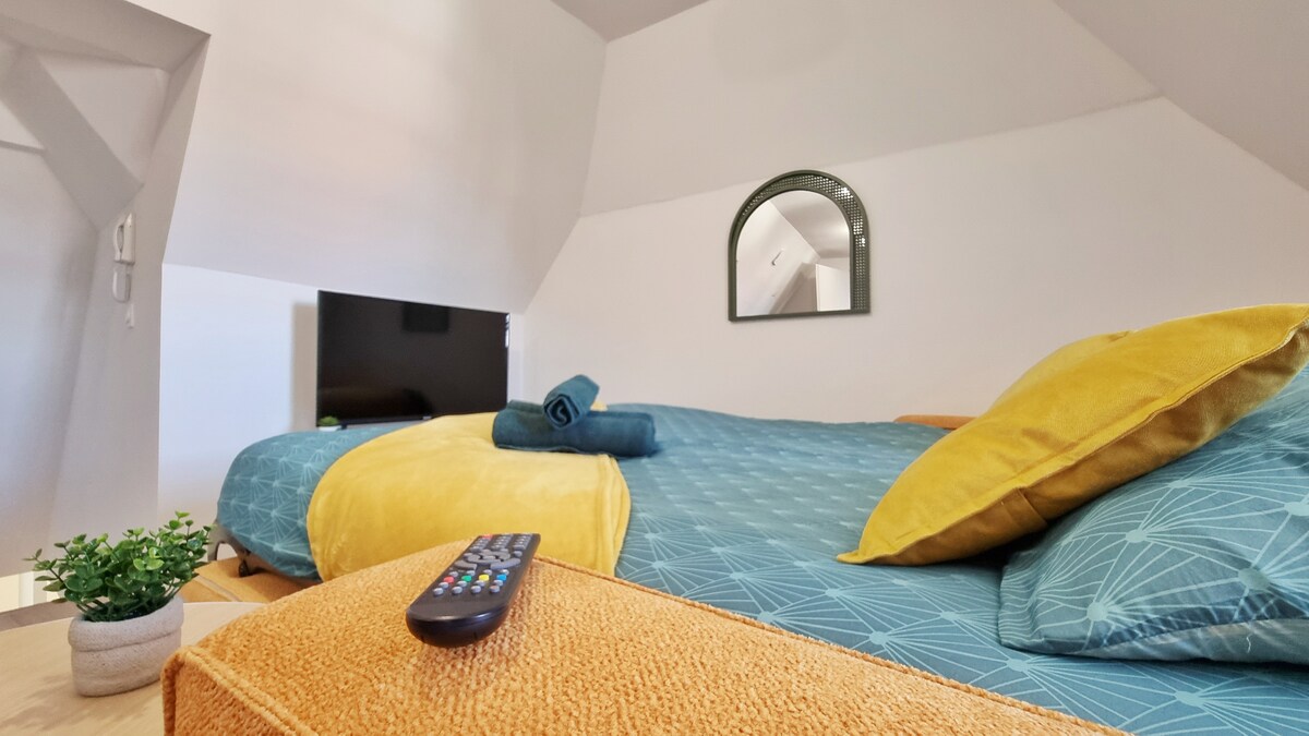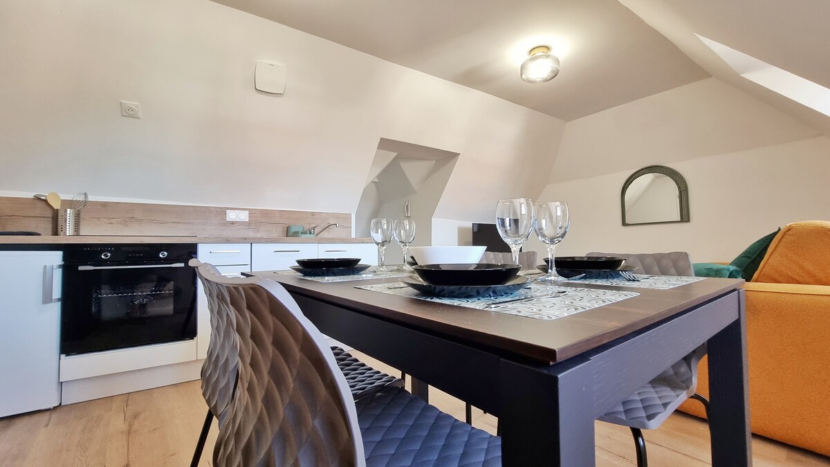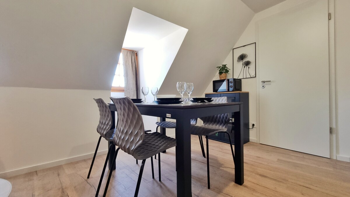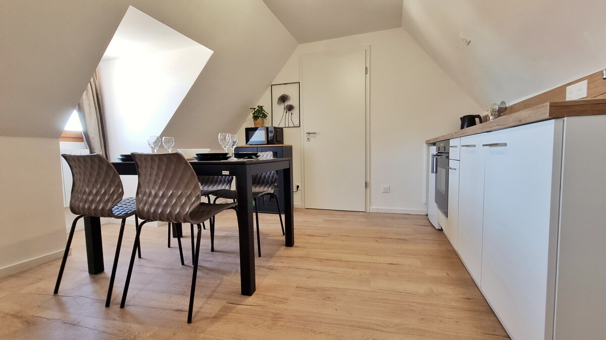 Dans une maison alsacienne du 17e siècle, découvrez "Le Cocon des toits", logement atypique, décoré avec goût, pour 2 ou 4 personnes. Il est situé au 3e et dernier étage sans ascenseur avec vue sur les toits alsaciens.Salon avec cuisine équipée, salle de bain avec toilettes séparées, et chambre indépendante.Il y a une chambre avec un lit (160 x 200) et un canapé-lit au salon (140 x 200). Pour vous permettre de venir l'esprit léger, les serviettes de toilette et draps vous seront fournis.