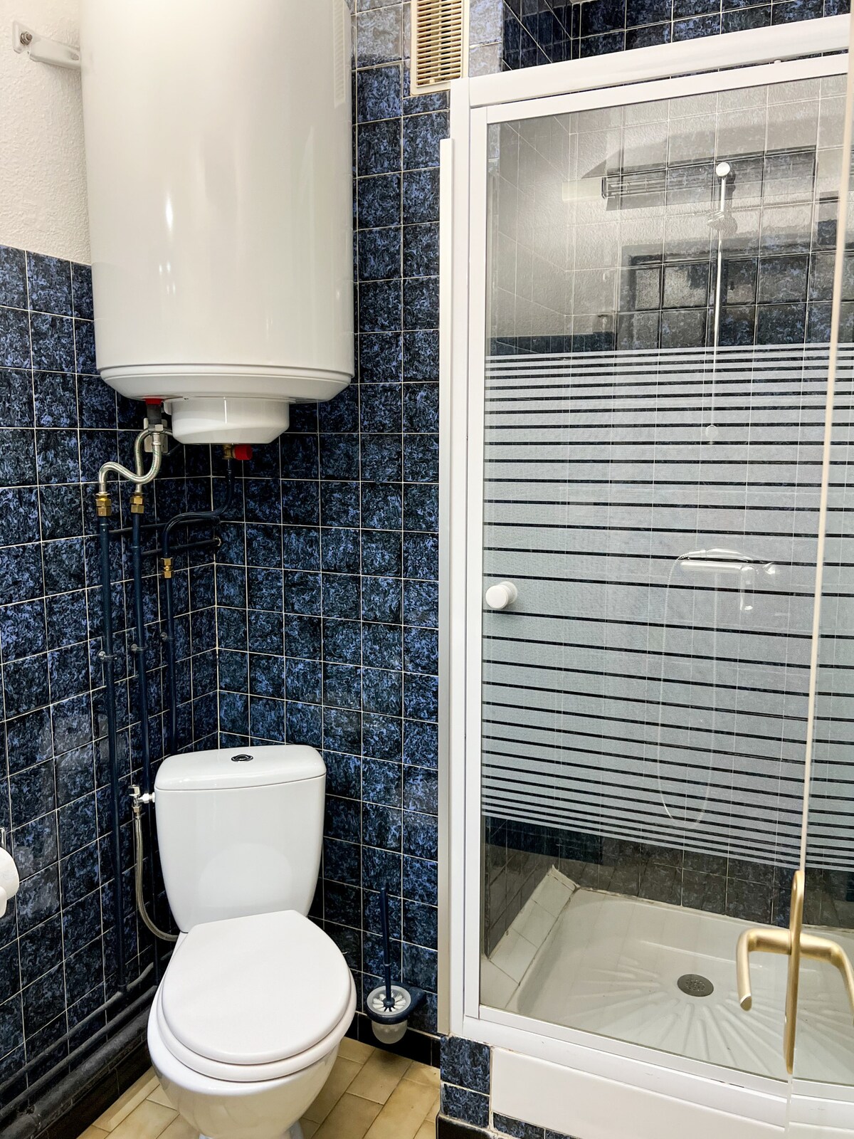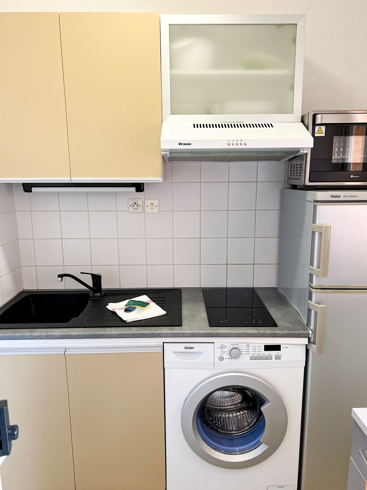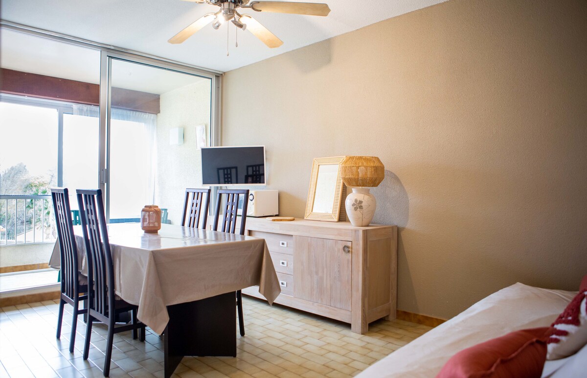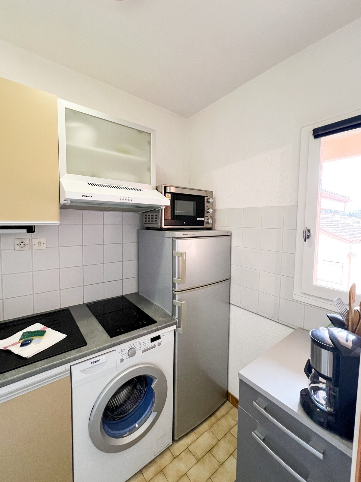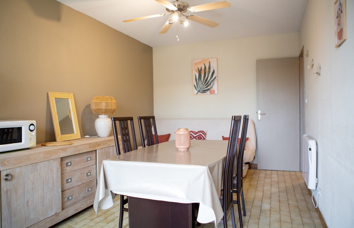 logement confortable à louer pour des vacances à argelès-sur-mer, à 5 minutes à pied de la plage. l'appartement est équipé d'une cuisine, d'un salon avec canapé convertible, d'une chambre avec lit double et d'une salle de bain fonctionnelle. il dispose également d'un parking privé et d'un balcon. le quartier offre de nombreuses commodités, notamment des restaurants, une plage et un supermarché.