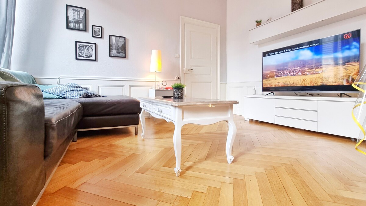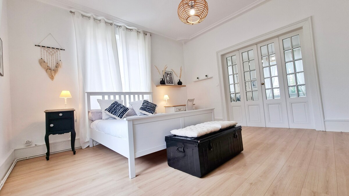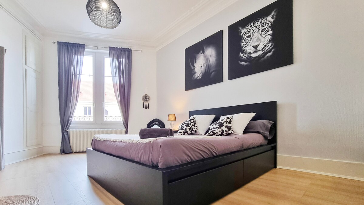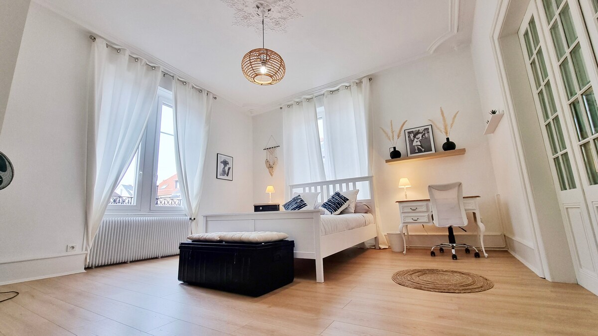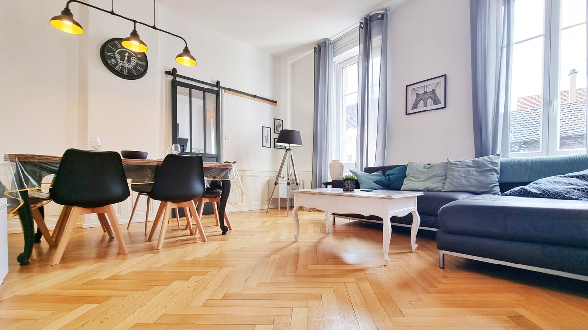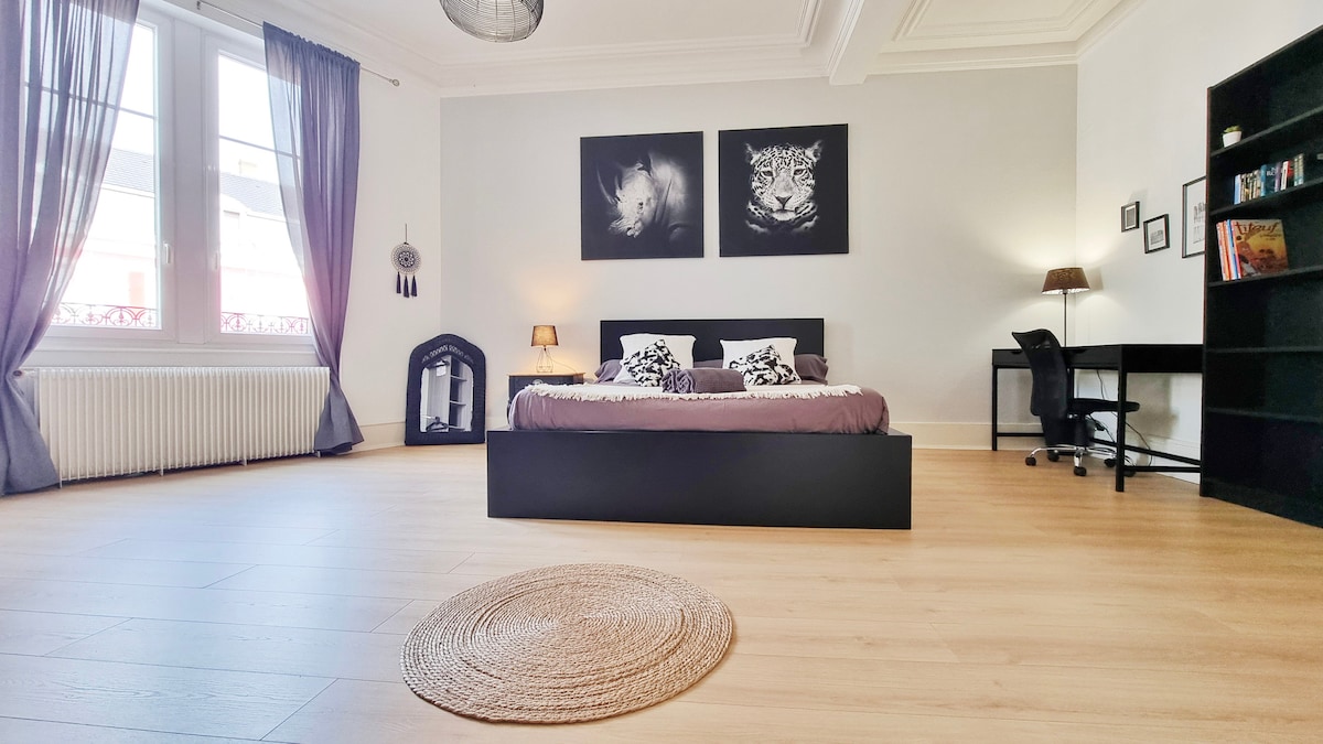 GRAND APPARTEMENT DE 114M2, de style haussmannien de 1904, entièrement rénové en 2021. Fonctionnel et de STANDING en plein CENTRE VILLE de COLMAR. RARE à la location saisonnière avec ses 3 grandes chambres, équipées de lits queen size ou lit double+ bureau et grand dressing. Logement sous alarme et bâtiment sous vidéosurveillance exterieurBien lire les conditions d arrivée et de départ.