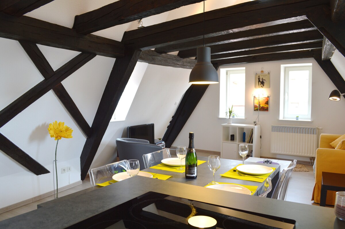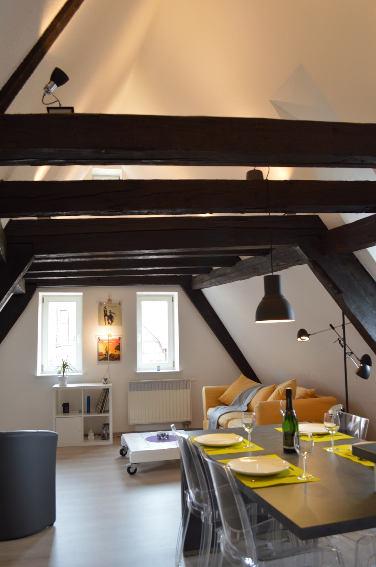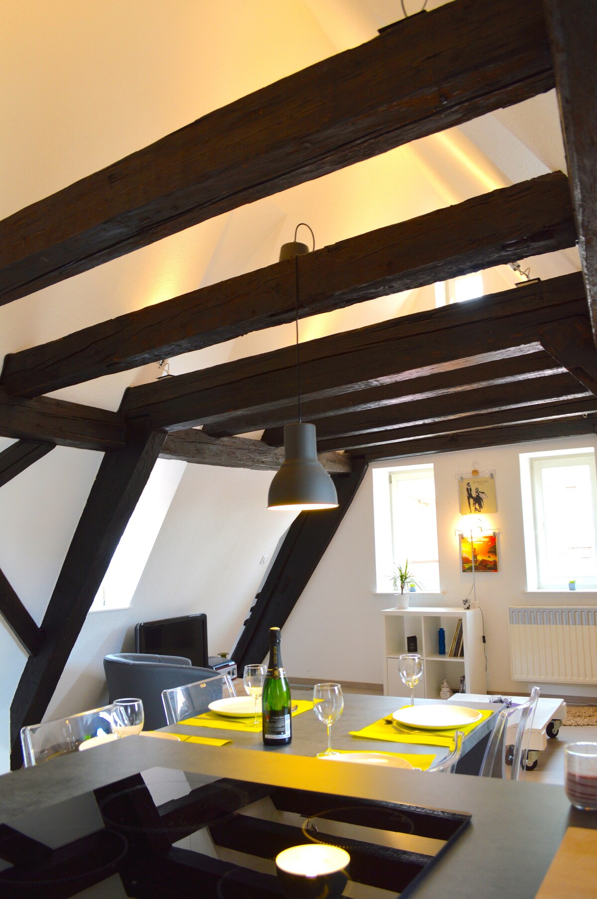 Dans l'hyper centre de Colmar, à quelques mètres à peine de la zone piétonne, dans une maison alsacienne du 17e siècle, découvrez cet appartement atypique, décoré avec goût, pour 2 ou 4 personnes. Point de départ idéal pour visiter la ville, vous logez à moins de 10 minutes à pieds des principaux sites touristiques colmariens !