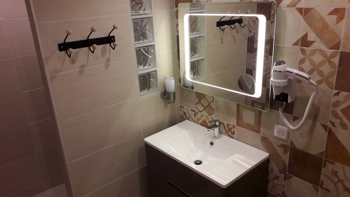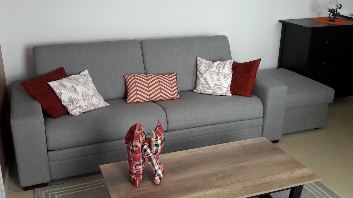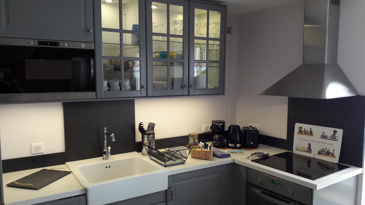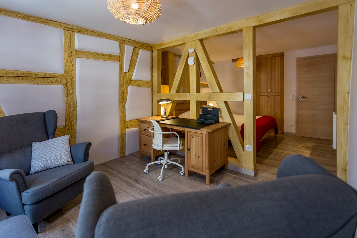 Appartement de 72 m2 avec 2 chambres, une salle de bain avec douche et WC séparé,1° étage: Vue sur Rue des Têtes et sur cour intérieure, 2 lits double (160×200), un séjour avec convertible (160×200), 1 TV, WIFI gratuit. Cuisine équipée de plaques induction, four, lave-linge, lave-vaisselle, micro-ondes, réfrigérateur-congélateur, grille-pain, machine à café, bouilloire, une table avec 6 chaises pour les repas, Draps et serviettes fournis, sèche-cheveux. Thé, café et gourmandises à disposition.