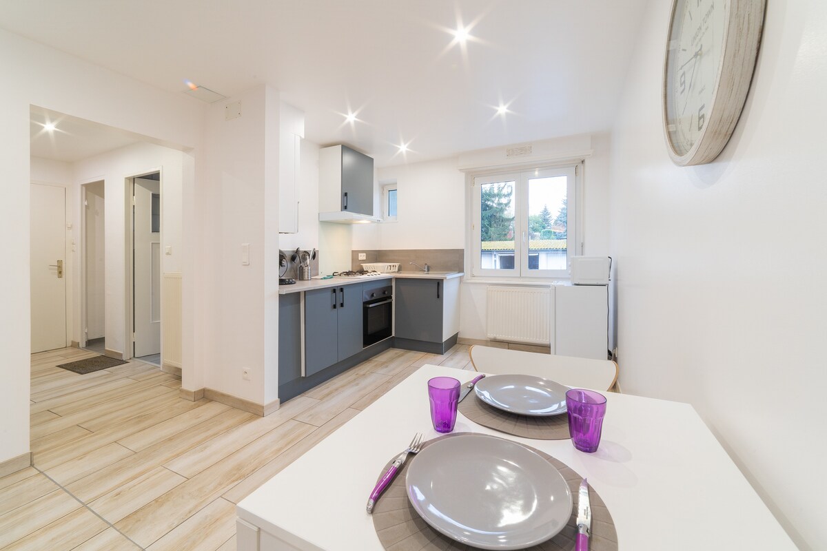 Ce magnifique appartement situé à Mulhouse vous offrira un espace convivial et propice au repos. Entièrement rénové avec goût, il dispose d'un salon confortable avec télévision et son canapé-lit, d'une salle d'eau avec machine à laver, d'une cuisine équipée et d'une chambre chaleureuse et accueillante avec son balcon. L'appartement répondra entièrement aux besoins des séjours professionnels et touristiques avec son parking collectif. => Réservez et Profitez ; )