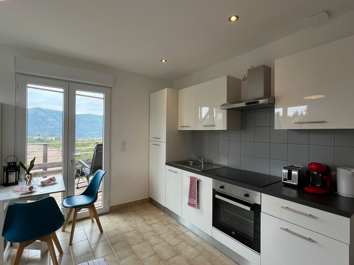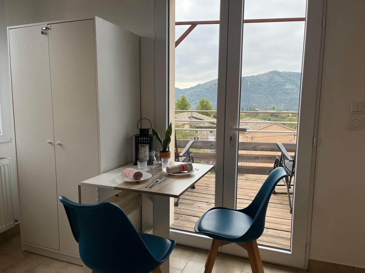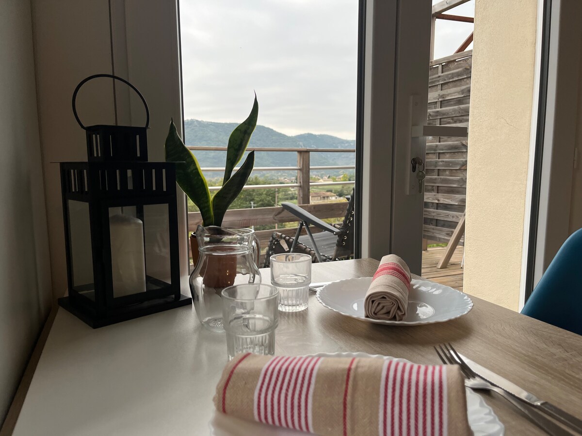 20 m² studio on the 2nd floor, perfect for 2 guests. It features a terrace with mountain and vineyard views, a fully equipped kitchen, a workspace, washing machine and dryer. Nestled in a quiet, green neighborhood, it’s the ideal place to relax and recharge, with free parking available on site.
