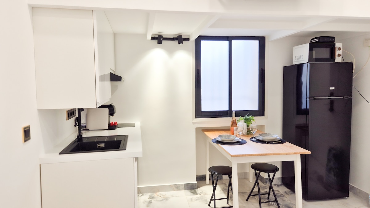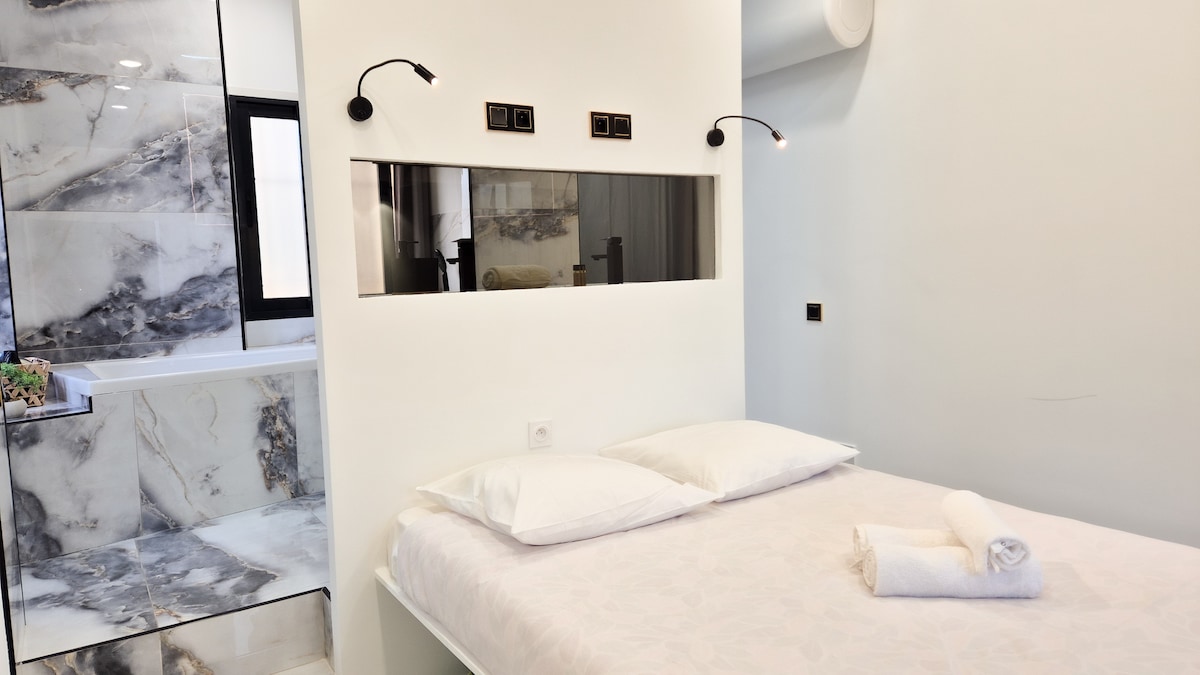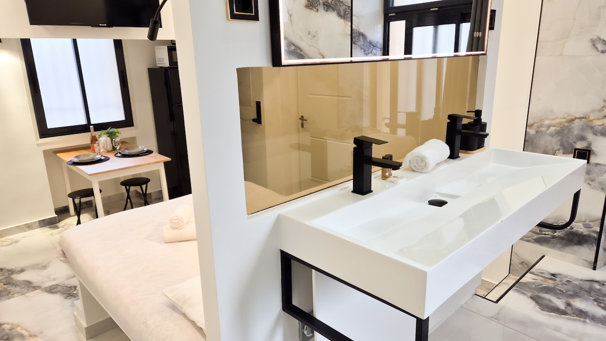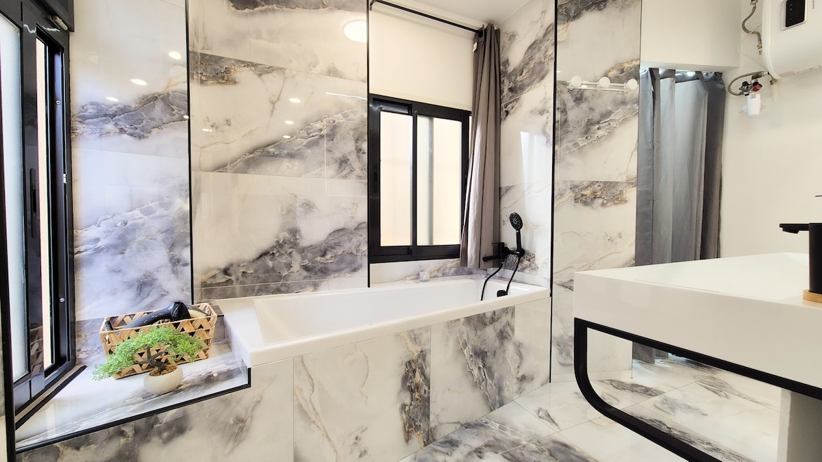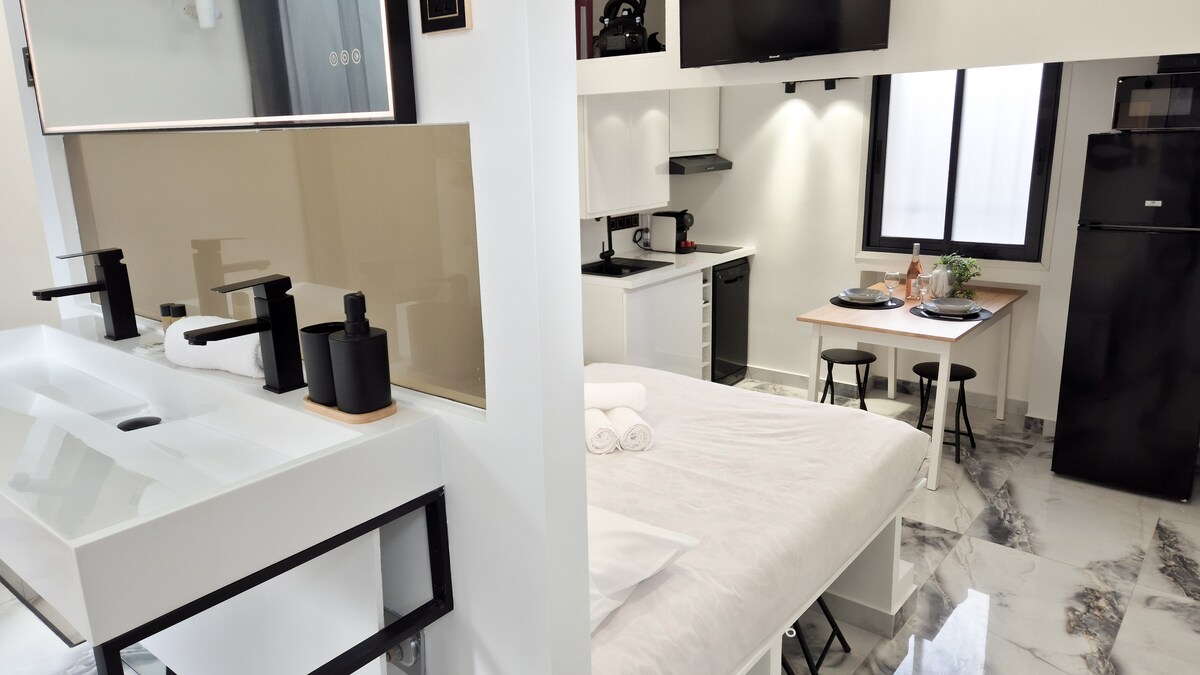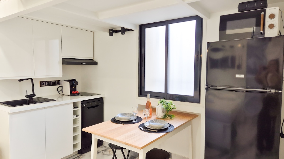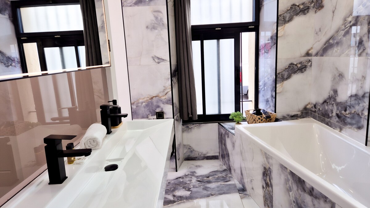 Enjoy a stylish retreat featuring a comfortable double bed, a marble-style bathroom with a bathtub, and a fully equipped kitchen.Ideal location: a lively neighborhood with a tram stop right outside, and restaurants, shops, and a movie theater all within walking distance.Perfect for a car-free stay and exploring Nice with ease.