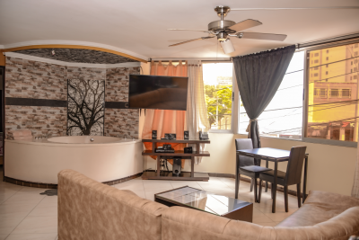 Two bedroom in Parque Poblado. This place offers accommodation with 2 queen beds, two ensuite bathrooms, hot tub in the living room, 3 flat screens, wifi, wall safes both rooms, full kitchen, air condition both rooms, washer and dryer in the apartment.