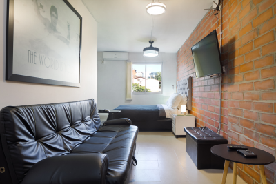 AC jacuzzi studio across the street from Exito. 4th floor stairs, AC ultra fast wifi, 2 flat screens, android TV with 2,000 channels, hot tub, full kitchen, shared washer and dryer and Queen bed. This place is very close to everything, restaurants below, supermarket across the street and lleras is 15 minute walk. Security from miracle building checks in here 4 times a night.